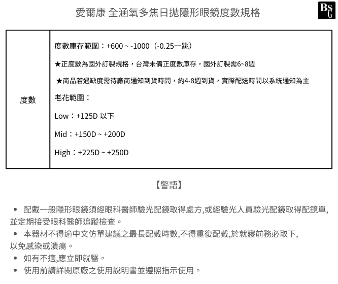 度數庫存範圍: +600 ~ -1000 (-25一跳,正度數為國外訂製規格,台灣未備正度數庫存國外訂製需6~8週)